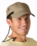 70% cotton/30% nylon low-profile 4-panel cap; Treated with a DuPont® Teflon® water and stain repellent; UV sun protection UPF 45+; Adjustable flexible nylon webbing outside hook and loop closure.; CoolPlus® terry cloth sweatband; Mesh on the two side panels; Shirt collar clip and cord in the rear;