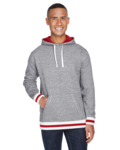 9.25 oz., 55% cotton 45% polyester heathered fleece; 1x1 yarndyed cuffs and waist; Lapover neckline with contrast lined hood; Set-on pouch pocket;